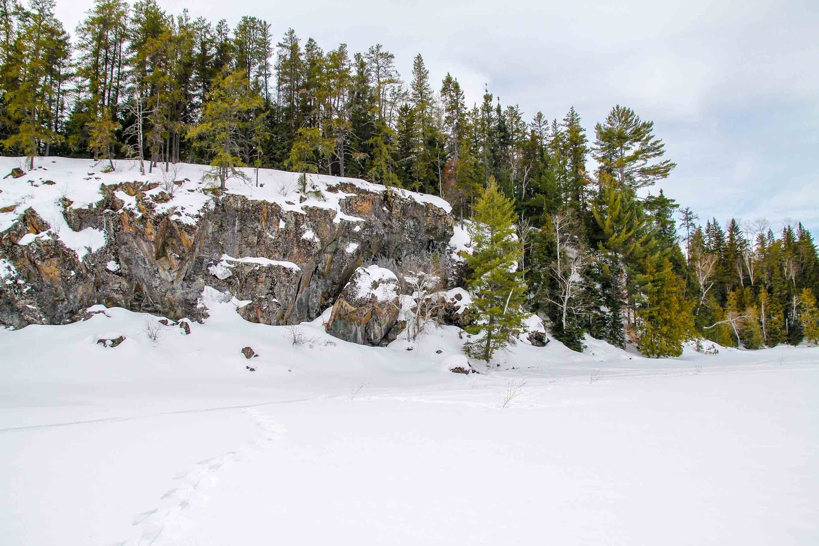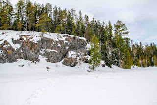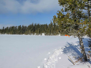 Went in to Diabase yesterday to see what the trail looked like. For one thing I was having trouble with the 1.5 in. or more with the snowshoes going under the crust with every step. Finally got to the lake and it was a bit better going, Somebody had been doing some fishing there but not recent. Took a couple of pics and headed back to the trail as I got closer to the shore there was a gap right at the shore I walked over to it and fell thru the ice with one snowshoe and when it hit the bottom it was muck and the shoe had got under the ice. The water didn't even get in to my boot but it took some time to get out of the mud and under the ice I poked the hole a bit larger to pull out the shoe still on my foot. Lesson learned.
