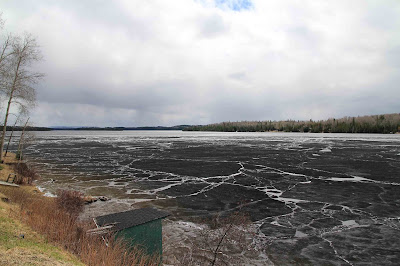 The ice has taken a beating after yesterdays storm. Wind was very strong put the power out for more than 24 hrs. Lots of trees down all over. The big spruce in the back of my yard has been shortend about 16 ft. Today the wind from the north has pushed all the ice down to the north part of the lake. At the edge it is just grinding it up, it may be wide open tomorrow.