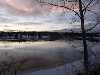 The last couple of days the night time temps have been well below zero. Ice is starting to form in the bays and have covered some. Tonight it will be still and cold, we may have a skim over all the lake. Here is a pic as the sun just went down.